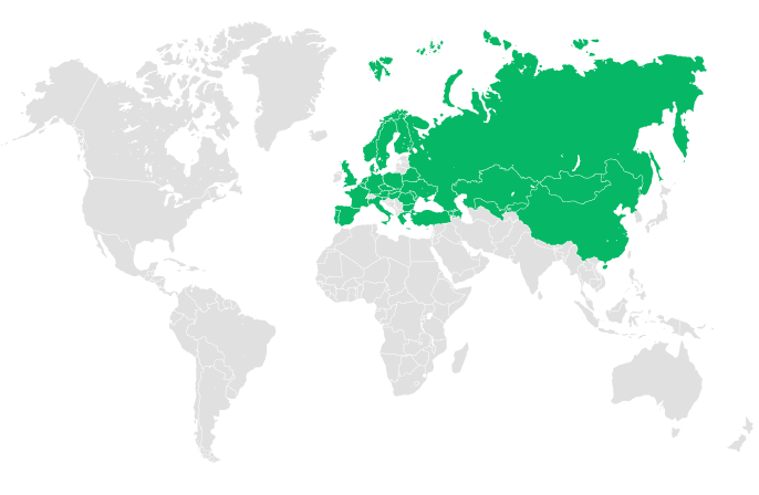 - Португалия, Испания, Франция, Великобритания, Бельгия, Голландия, Люксембург, Германия, Дания, Чехия, Швеция, Норвегия, Финляндия, Австрия, Италия, Словения, Венгрия, Словакия, Польша, Болгария, Турция, Греция, Румыния, Молдавия, Украина, Беларусь, РФ, Грузия, Азербайджан, Армения, Казахстан, Узбекистан, Киргизия, Монголия, Китай.
