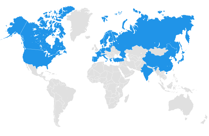 - Словения, Италия, Франция, Испания, Португалия, Бельгия, Голландия, Германия, Норвегия, Швеция, Дания, Польша, Финляндия, РФ, Литва, Эстония, Латвия, Турция, Греция, Китай, Индия, Япония, Южная Корея, США, Канада.