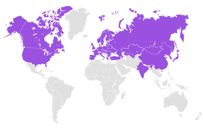 - Португалия, Испания, Франция, Великобритания, Бельгия, Голландия, Люксембург, Германия, Дания, Чехия, Швеция, Норвегия, Финляндия, Австрия, Италия, Словения, Венгрия, Словакия, Польша, Литва, Эстония, Латвия, Болгария, Турция, Греция, Румыния, Молдавия, Украина, Беларусь, РФ, Грузия, Азербайджан, Армения, Казахстан, Узбекистан, Киргизия, Монголия, Китай, Индия, Япония, Южная Корея, США, Канада.